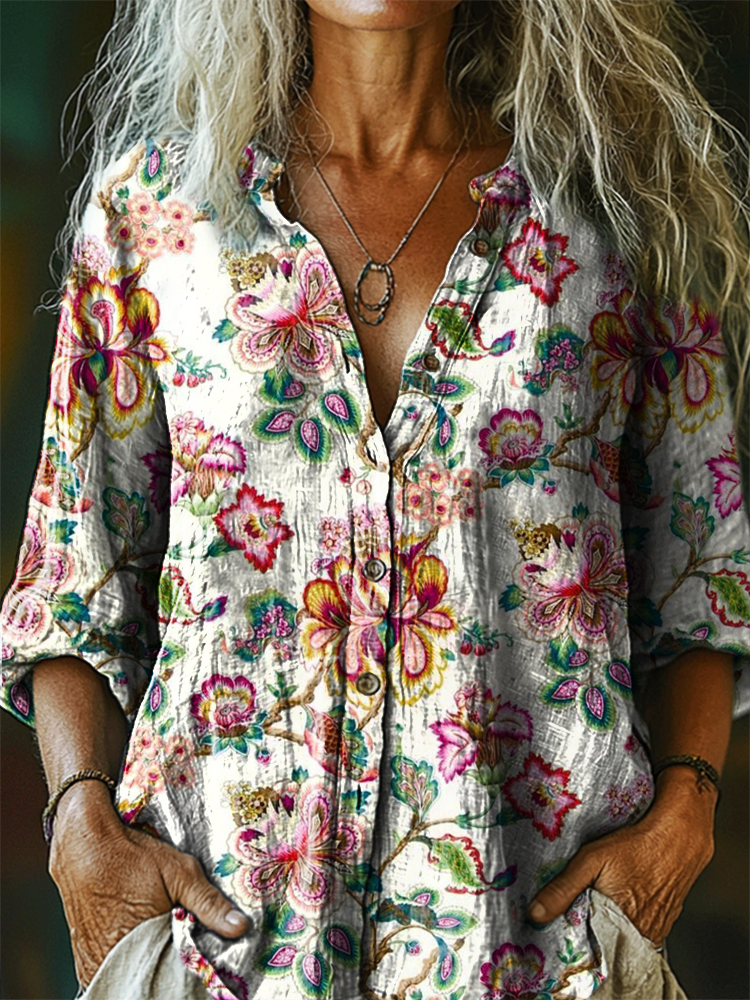 Women's Vintage Floral Art Print Casual Cotton Linen Shirt
