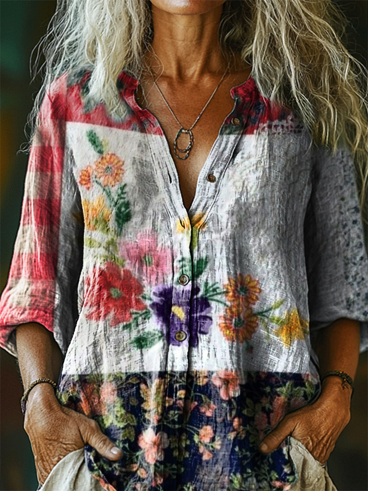 Women's Vintage Floral Art Print Casual Cotton Linen Shirt
