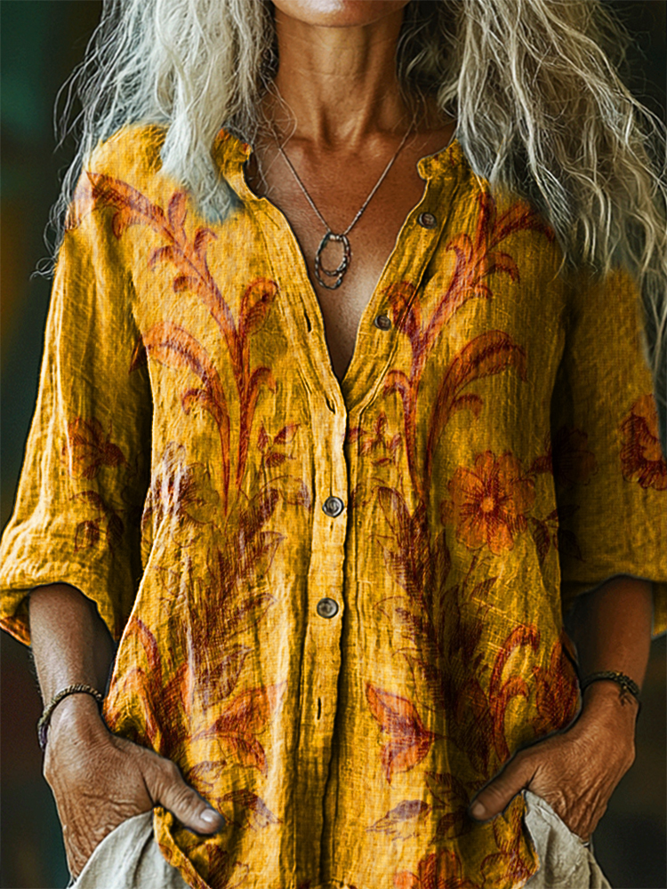 Women's Vintage Floral Art Print Casual Cotton Linen Shirt