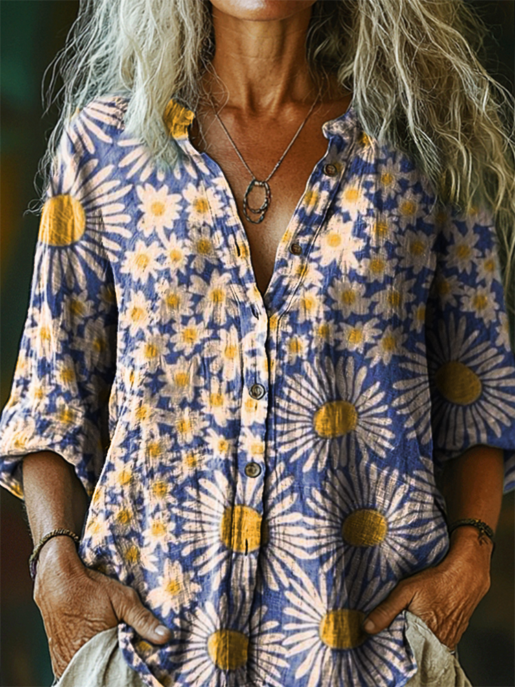 Women's Vintage Floral Art Print Casual Cotton Linen Shirt