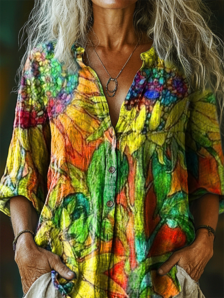 Women's Vintage Floral Art Print Casual Cotton Linen Shirt