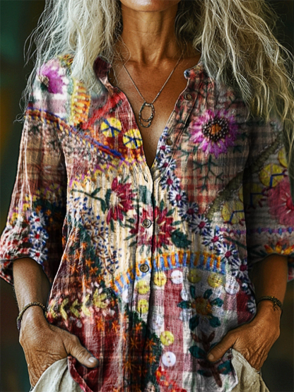 Women's Vintage Floral Art Print Casual Cotton Linen Shirt