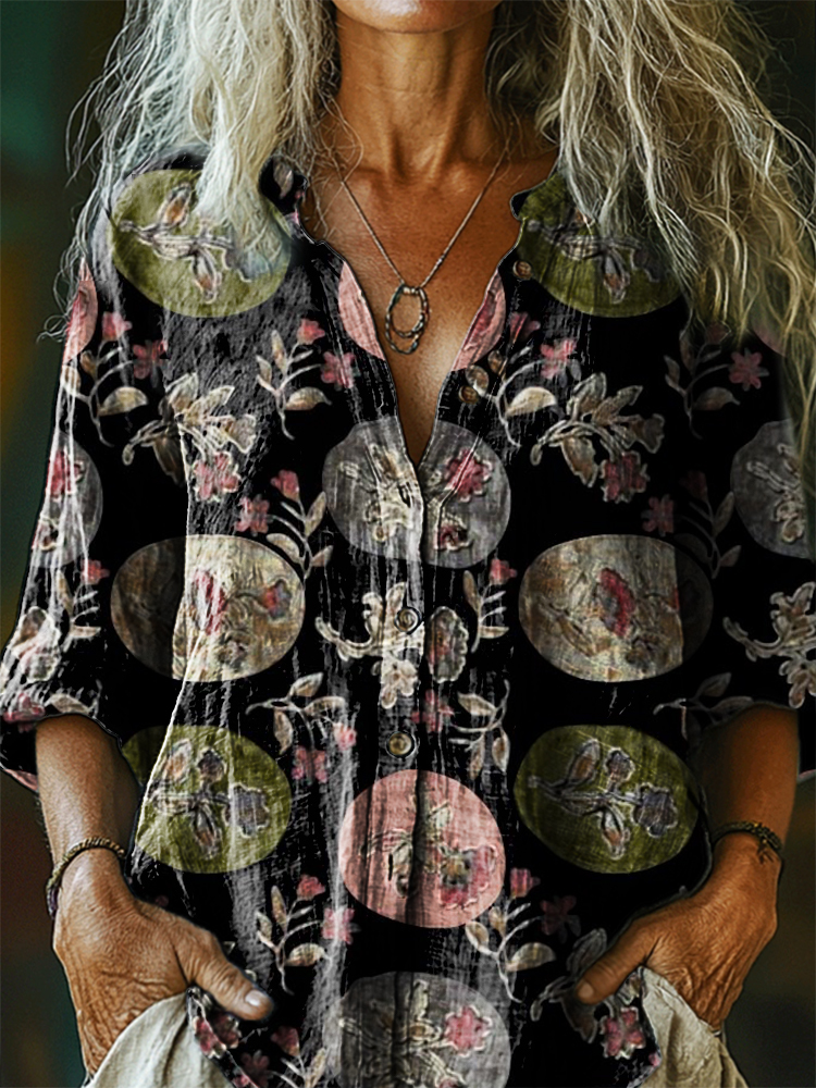 Women's Vintage Floral Art Print Casual Cotton Linen Shirt