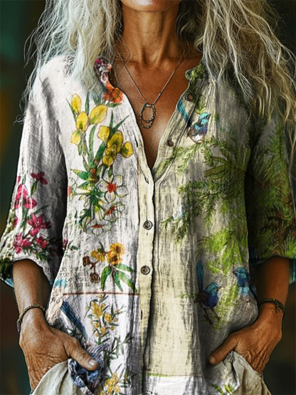 Women's Vintage Floral Art Print Casual Cotton Linen Shirt