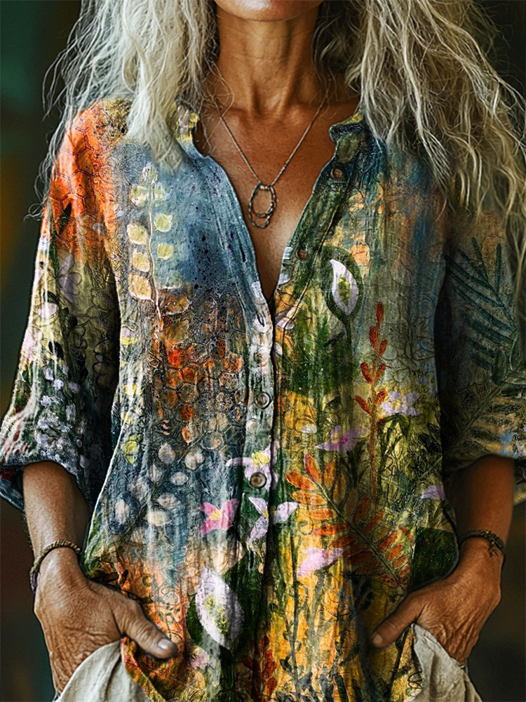 Women's Vintage Floral Art Print Casual Cotton Linen Shirt