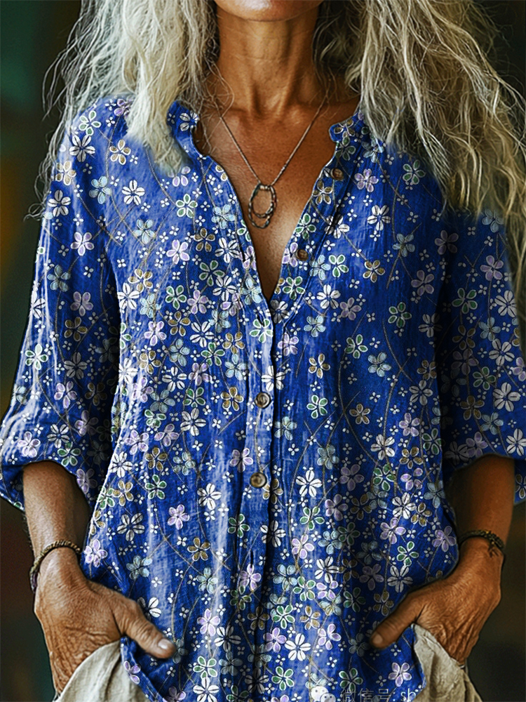 Women's Vintage Floral Art Print Casual Cotton Linen Shirt