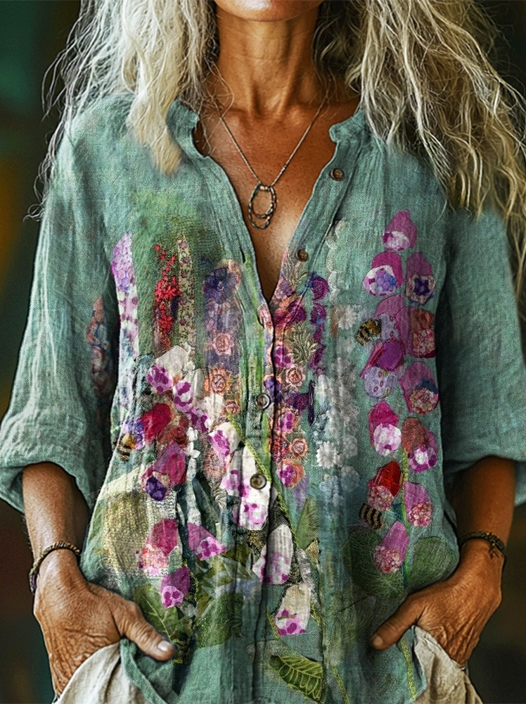 Women's Vintage Floral Art Print Casual Cotton Linen Shirt