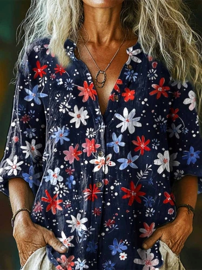 Women's Vintage Floral Art Print Cotton and Linen Shirt