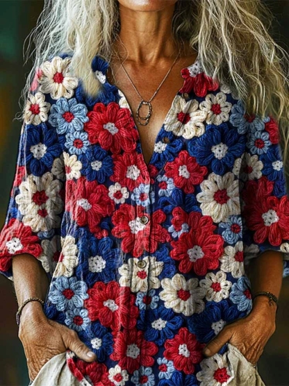 Women's Vintage Floral Art Print Cotton and Linen Shirt