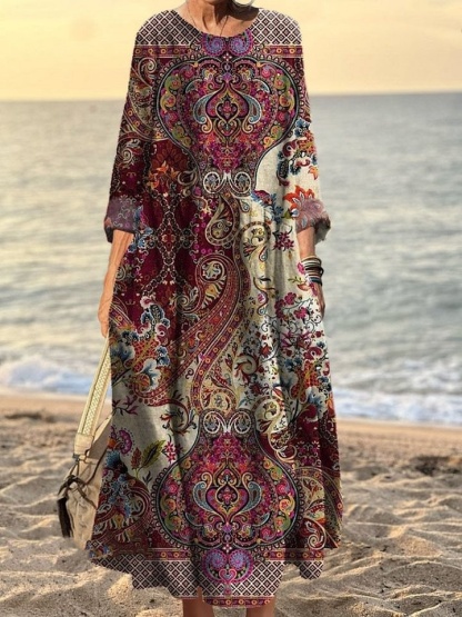 Women's Vintage Floral Art Print Pocket Cotton Dress