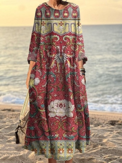Women's Vintage Floral Art Print Pocket Cotton Dress
