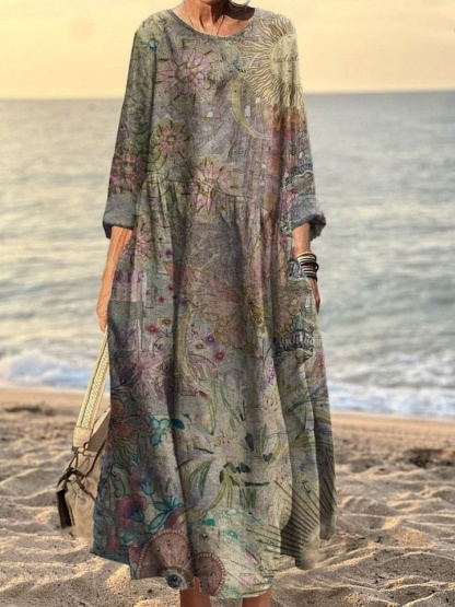 Women's Vintage Floral Art Print Pocket Cotton Dress