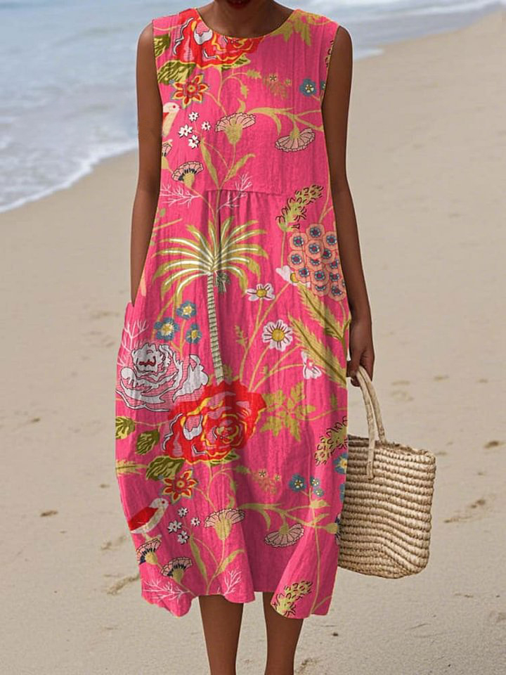 Women's Vintage Floral Art Print Sleeveless Cotton Pocket Wrap Dress