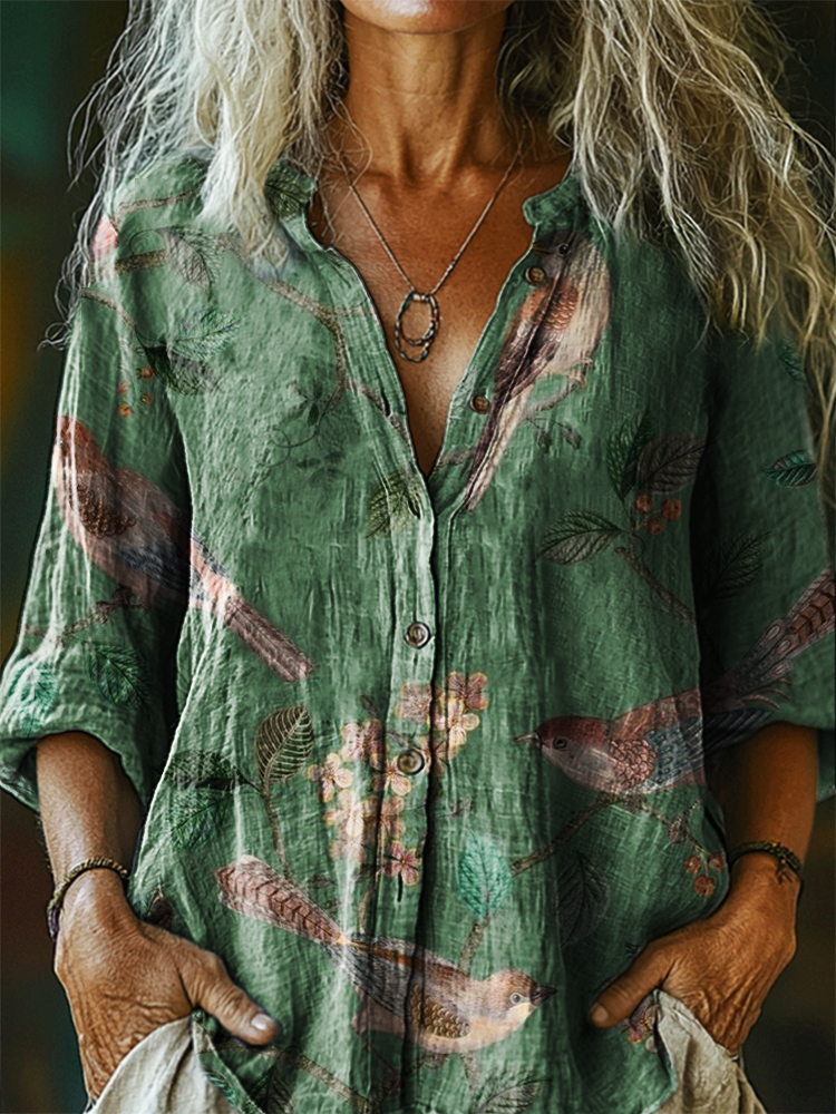 Women's Vintage Floral Bird Art Print Casual Cotton Linen Shirt