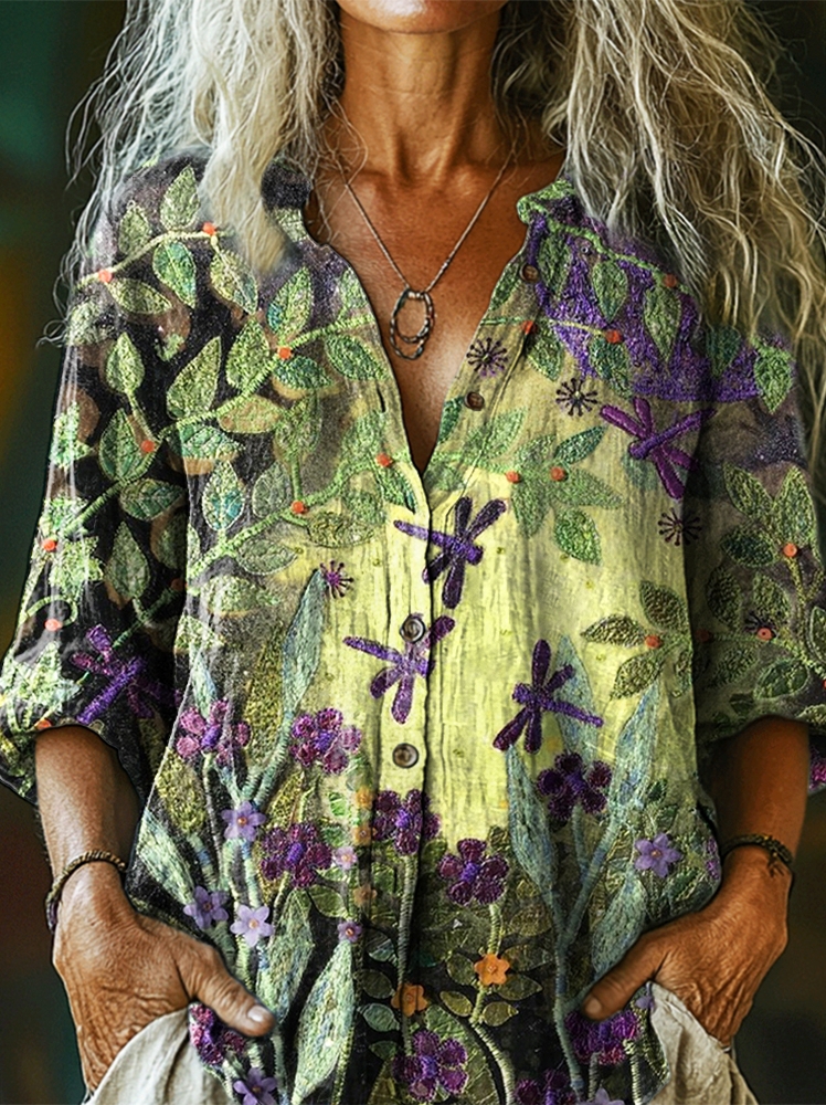 Women's Vintage Floral Dragonfly Art Print Casual Cotton Linen Shirt