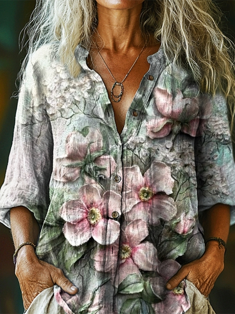 Women's Vintage Floral Ethnic Art Print Casual Cotton Linen Shirt