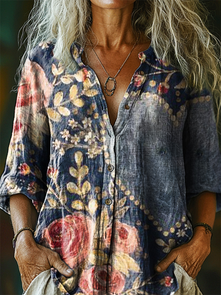 Women's Vintage Floral Love Art Print Casual Cotton Linen Shirt