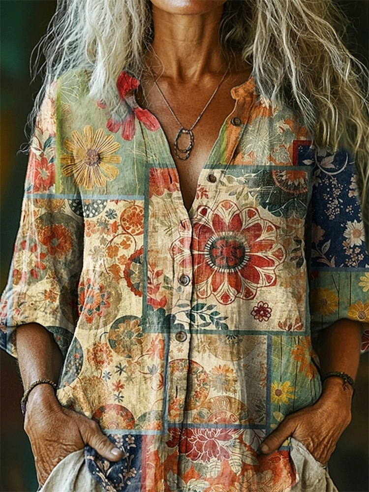 Women's Vintage Floral Pattern Art Print Casual Cotton Linen Shirt