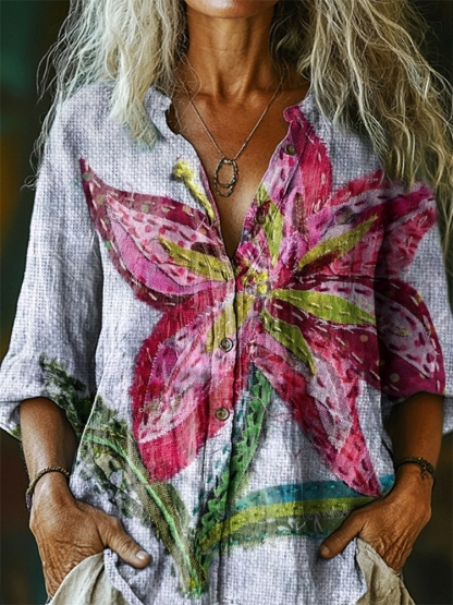 Women's Vintage Floral Pattern Art Print Casual Cotton Linen Shirt