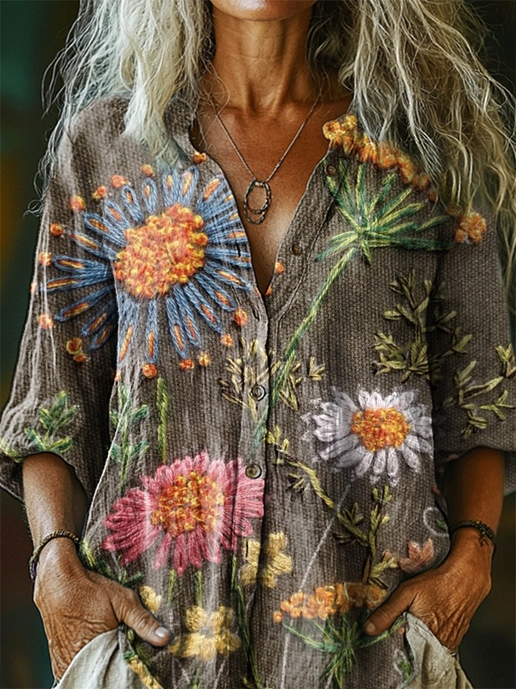Women's Vintage Floral Pattern Art Print Casual Cotton Linen Shirt