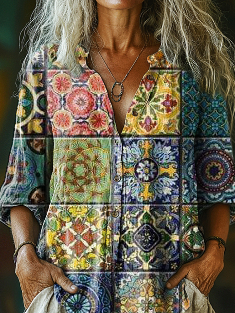 Women's Vintage Floral Tattoo Pattern Art Print Casual Cotton Linen Shirt
