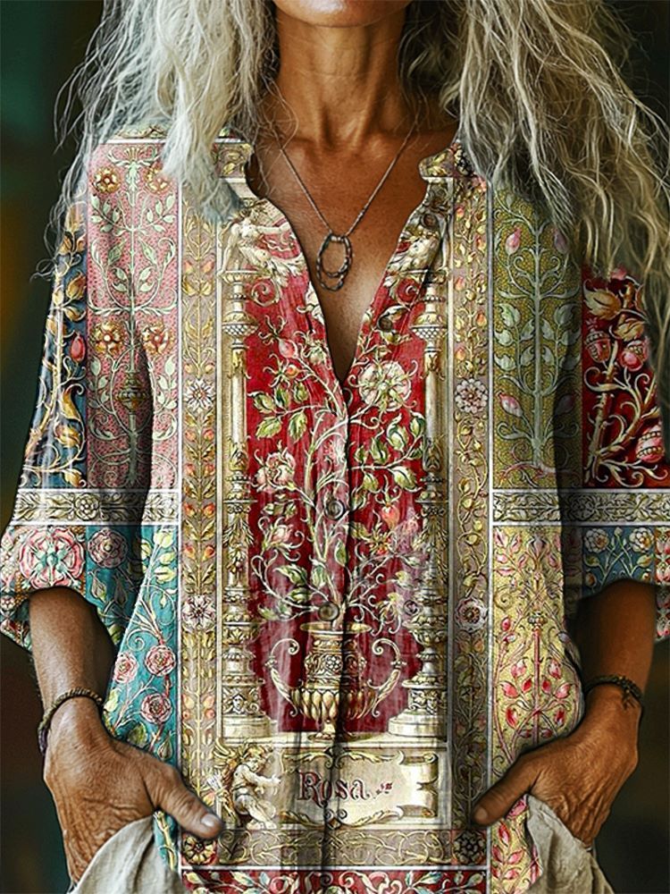 Women's Vintage Floral Tattoo Pattern Art Print Casual Cotton Linen Shirt