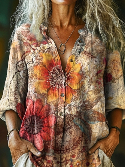 Women's Vintage Flower Art Print Casual Cotton Linen Shirt
