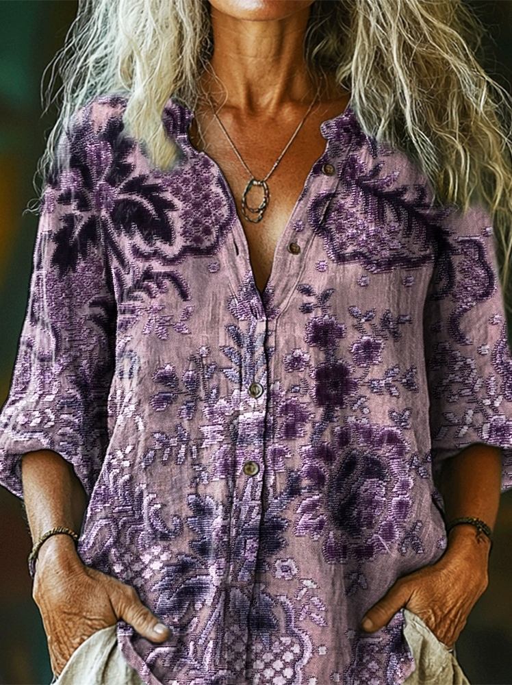 Women's Vintage Flower Art Print Casual Cotton Linen Shirt
