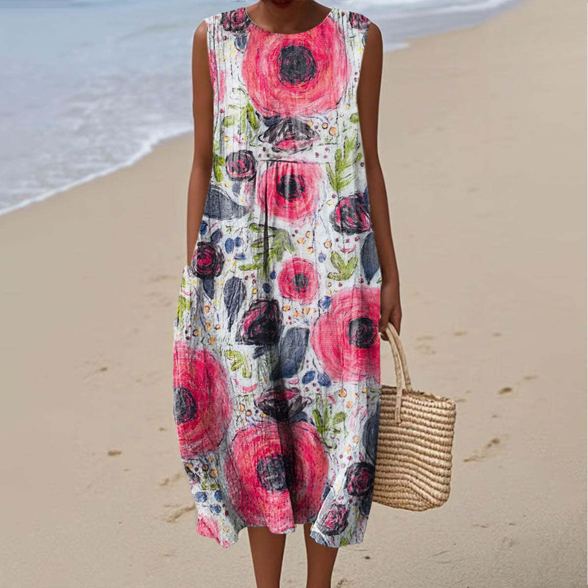 Women's Vintage Flower Art Print Sleeveless Cotton Pocket Wrap Dress