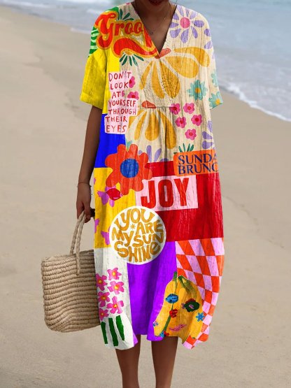 Women's Vintage Flower Geometric Irregular Patchwork Art Print Flowy Dress