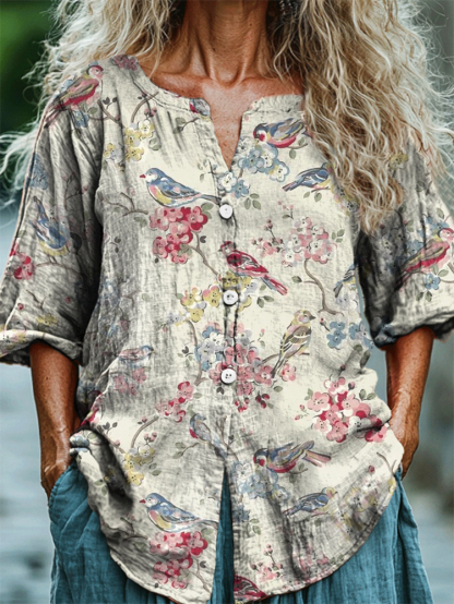 Women's Vintage Flowers Birds Print Casual Cotton Linen Shirt