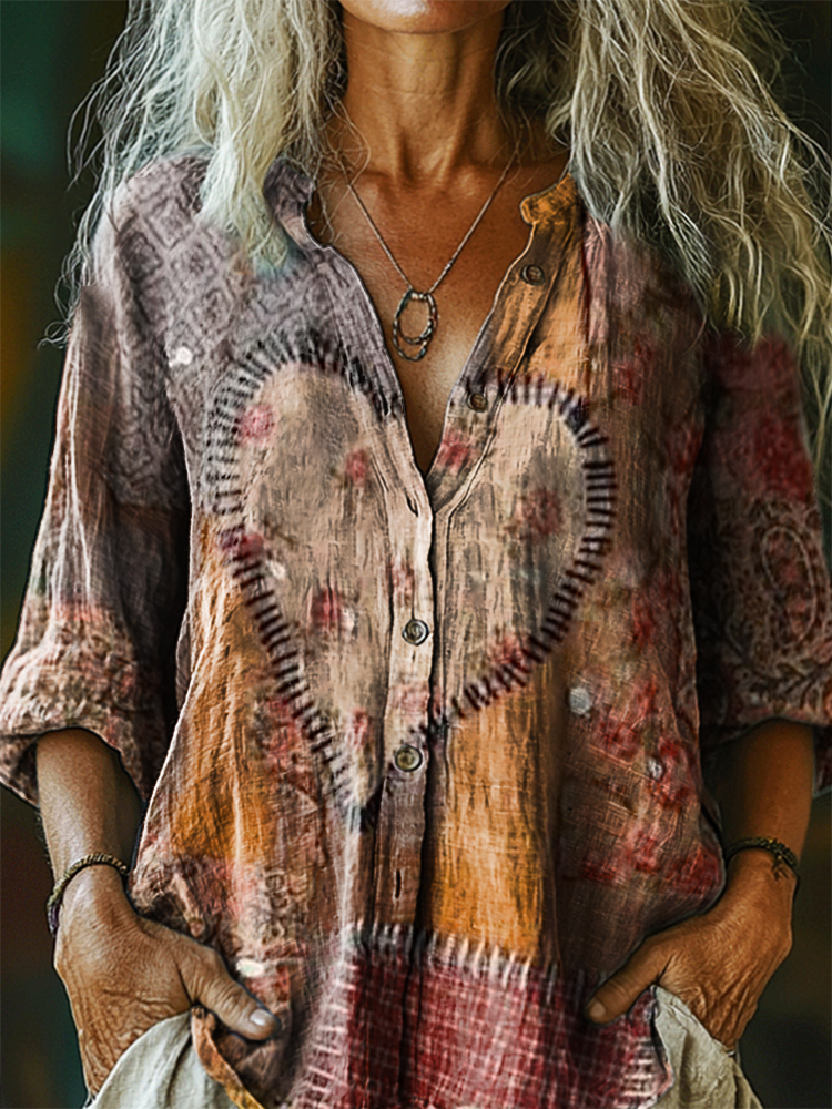 Women's Vintage Heart Pattern Art Print Casual Cotton Linen Shirt