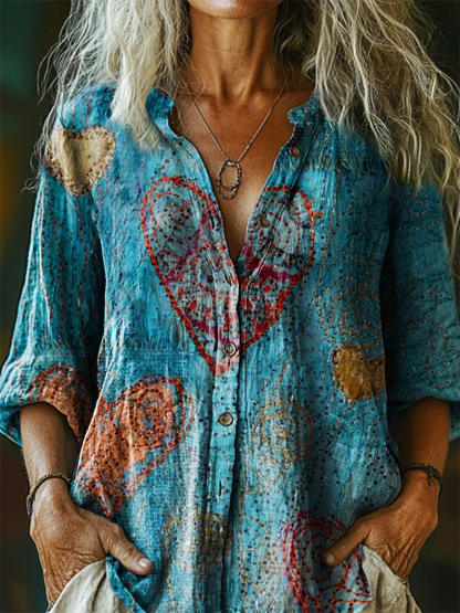 Women's Vintage Love Art Print Casual Cotton Linen Shirt
