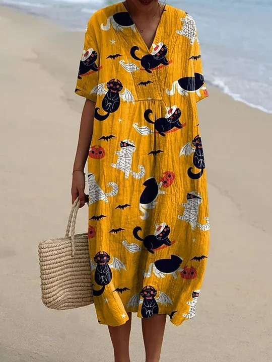 Women's Vintage Lovely Black Cats Halloween Art Print Flowy Dress