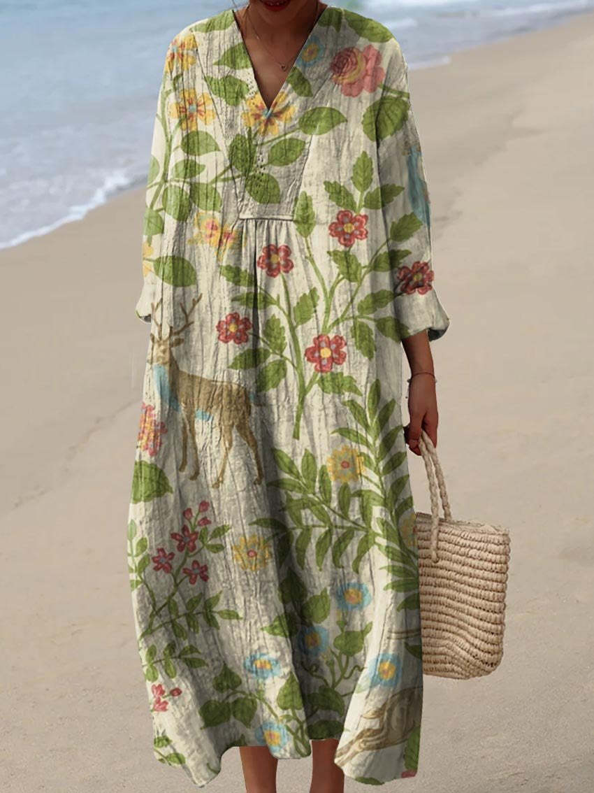 Women's Vintage Lovely Floral Animals Art Print Flowy Dress
