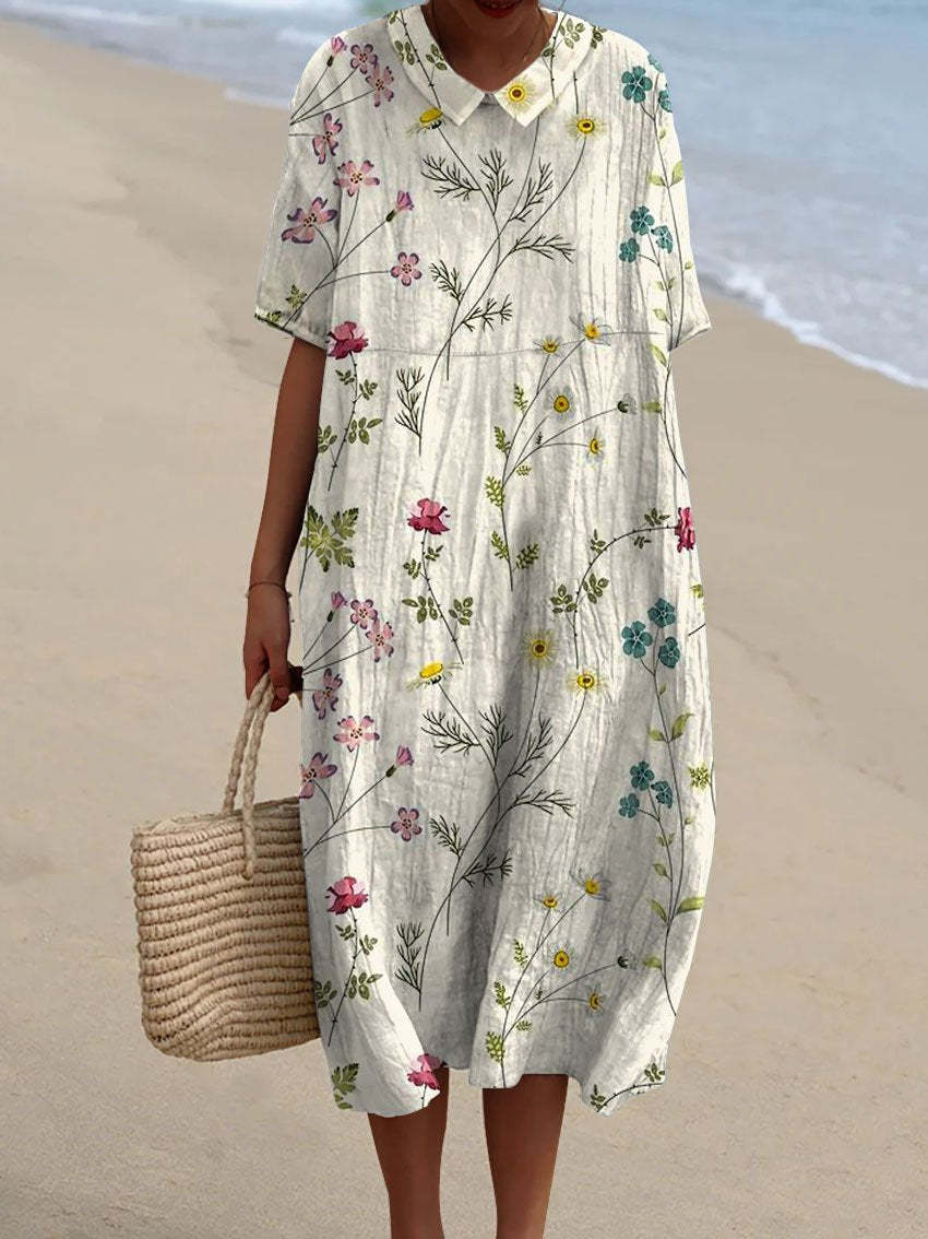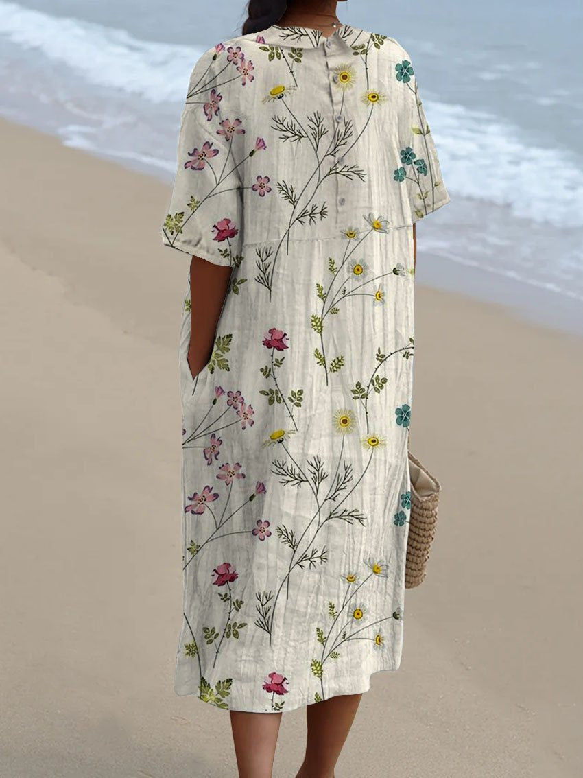 Women's Vintage Lovely Floral Art Print Pocket Linen Dress(Convertible Dress With Front And Back Option)
