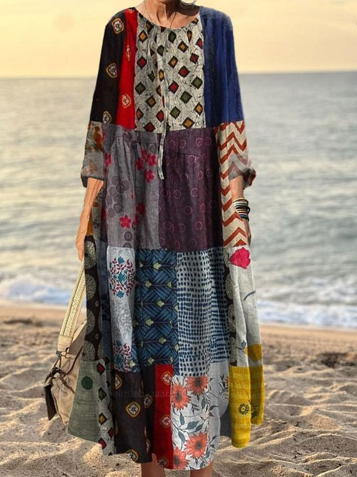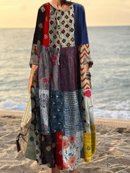 Women's Vintage Patchwork Art Print Pocket Cotton Dress