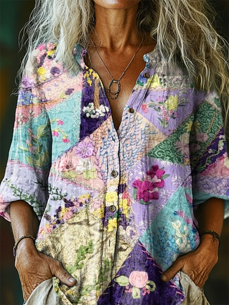 Women's Vintage Patchwork Pattern Art Print Casual Cotton Linen Shirt