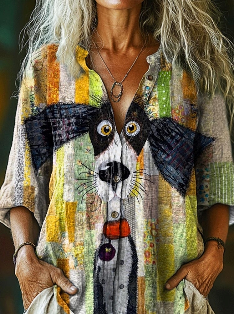 Women's Vintage Puppy Collage Art Print Casual Cotton Linen Shirt