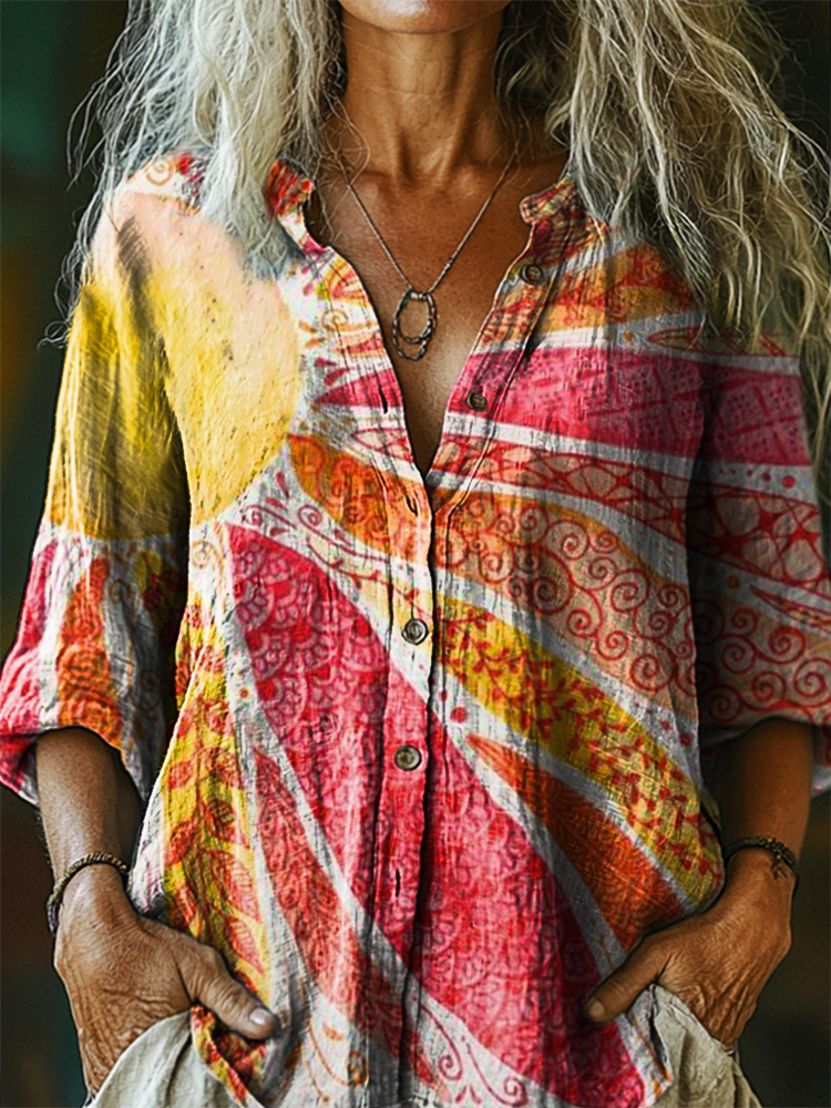 Women's Vintage Sun Collage Art Print Casual Cotton Linen Shirt