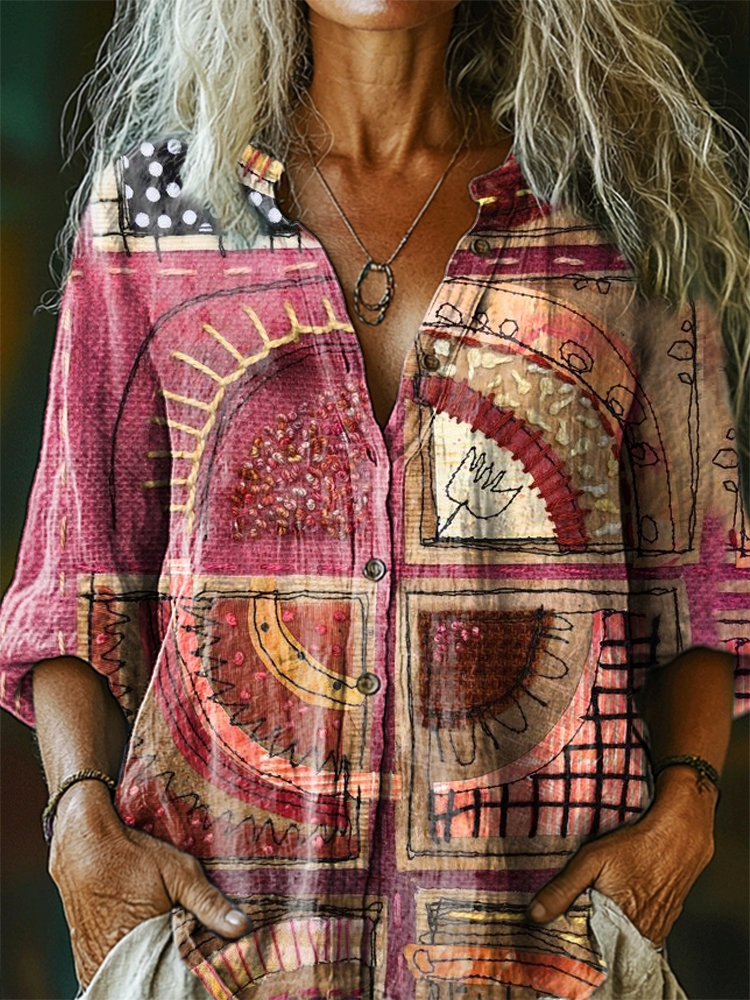 Women's Vintage Tattoo Pattern Art Print Casual Cotton Linen Shirt
