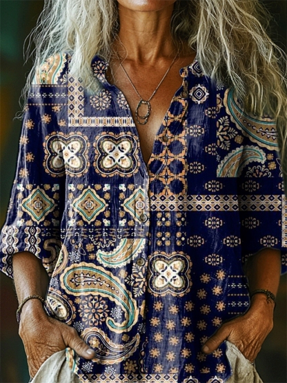 Women's Vintage Tattoo Pattern Art Print Casual Cotton Linen Shirt