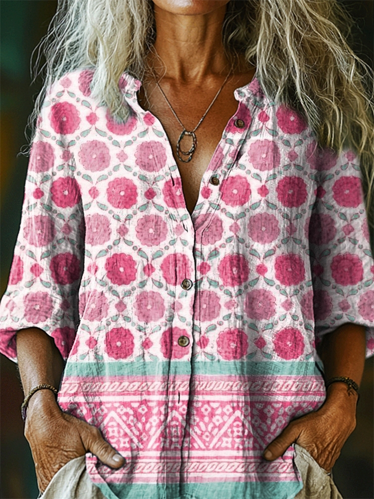 Women's Vintage Tattoo Pattern Art Print Casual Cotton Linen Shirt
