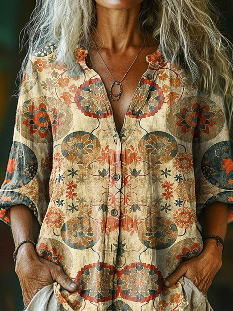 Women's Vintage Tattoo Pattern Art Print Casual Cotton Linen Shirt