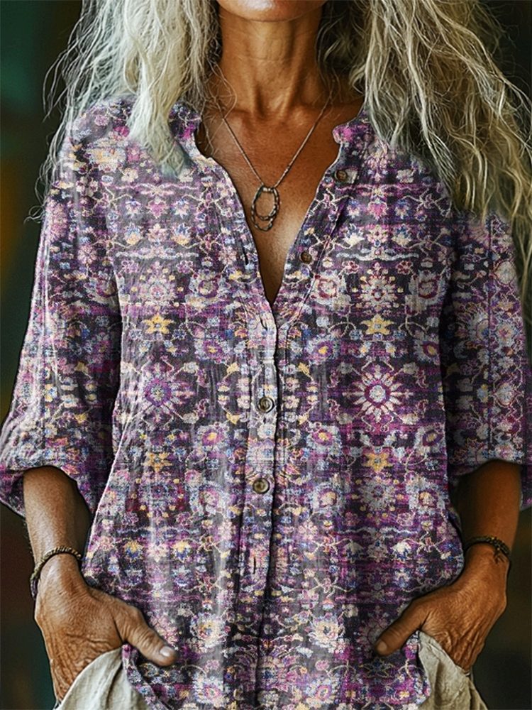 Women's Vintage Tattoo Pattern Art Print Linen Cotton Casual Shirt