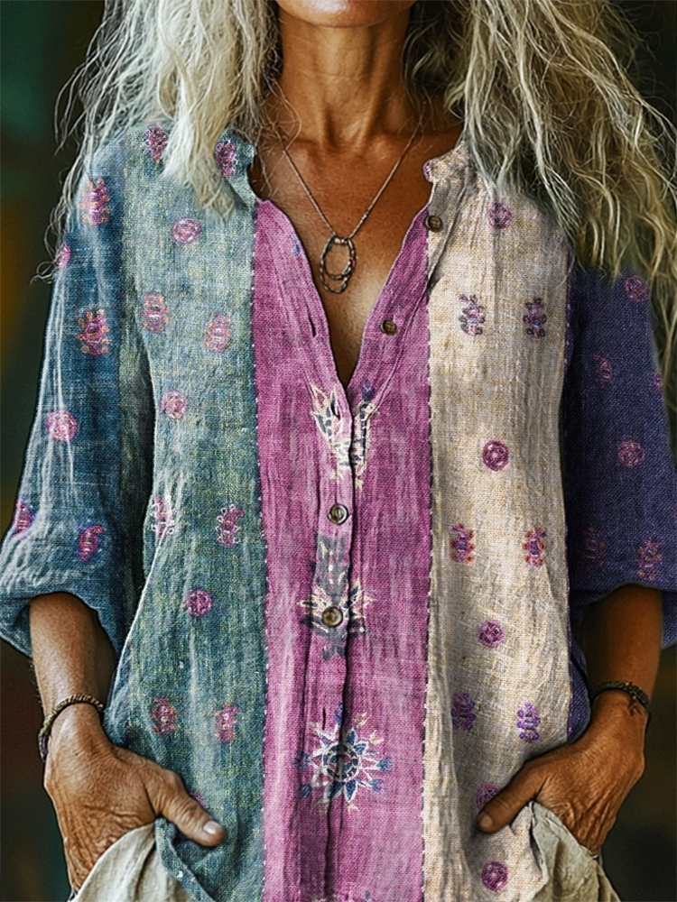 Women's Vintage Tattoo Pattern Art Print Linen Cotton Casual Shirt