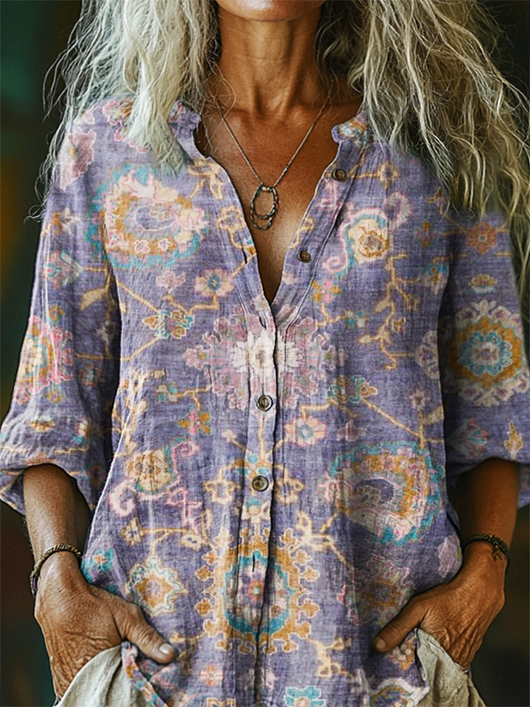 Women's Vintage Tattoo Pattern Art Print Linen Cotton Casual Shirt