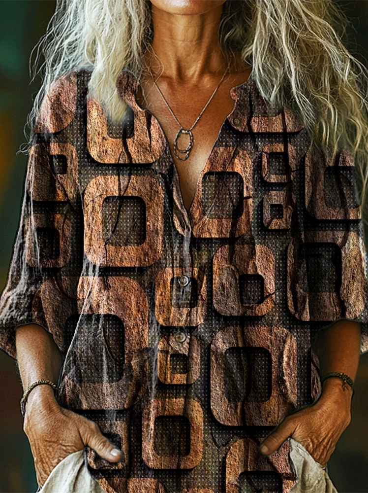 Women's Vintage Textured Art Print Casual Cotton Shirt