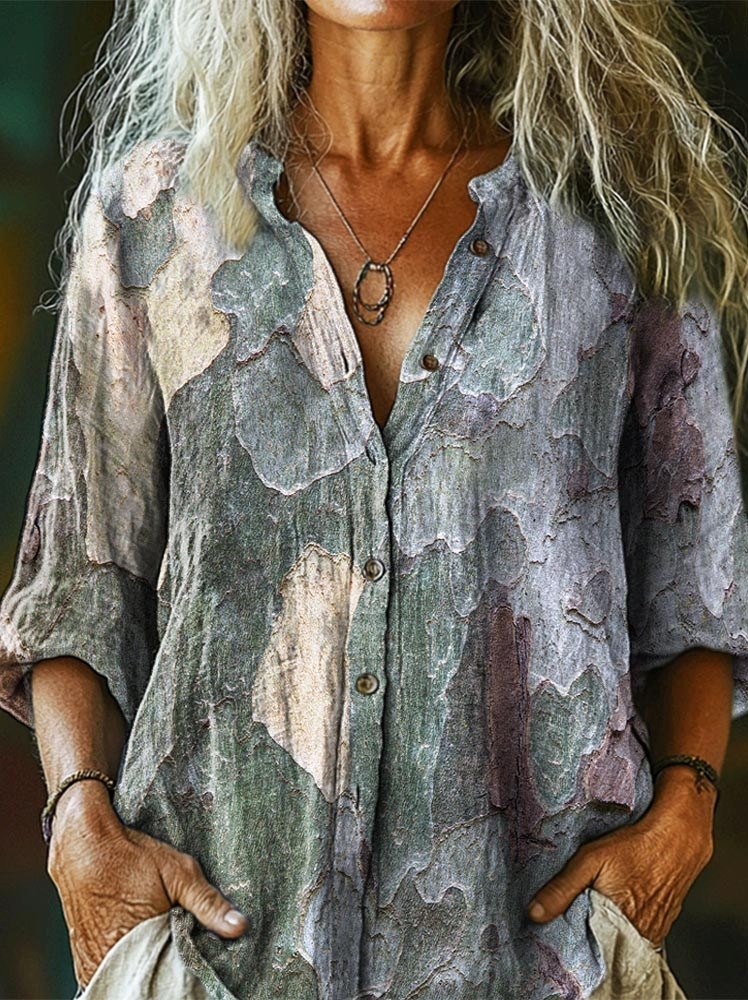 Women's Vintage Textured Graphic Print Button-Down Comfort Cotton Shirt