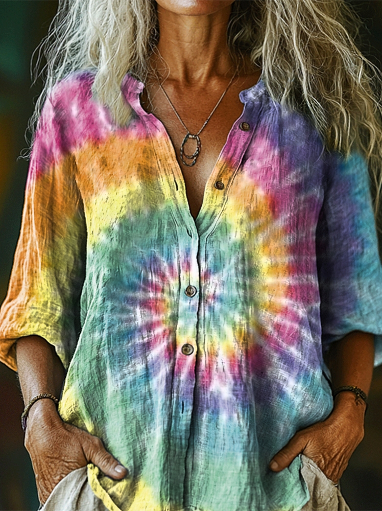Women's Vintage Tie Dye Art Print Casual Cotton Linen Shirt